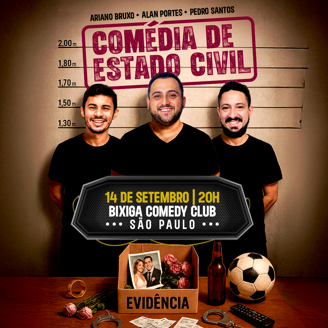 Em “Comédia de Estado Civil”, Alan Portes, Ariano Bruxo e Pedro Santos sobem ao palco para transformar em riso as dores e delícias de ser solteiro, casado ou divorciado.